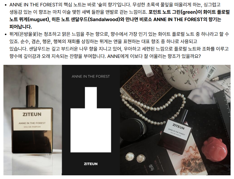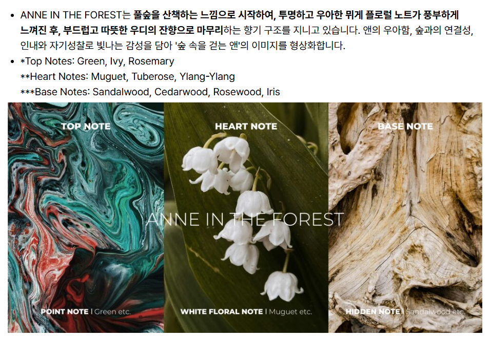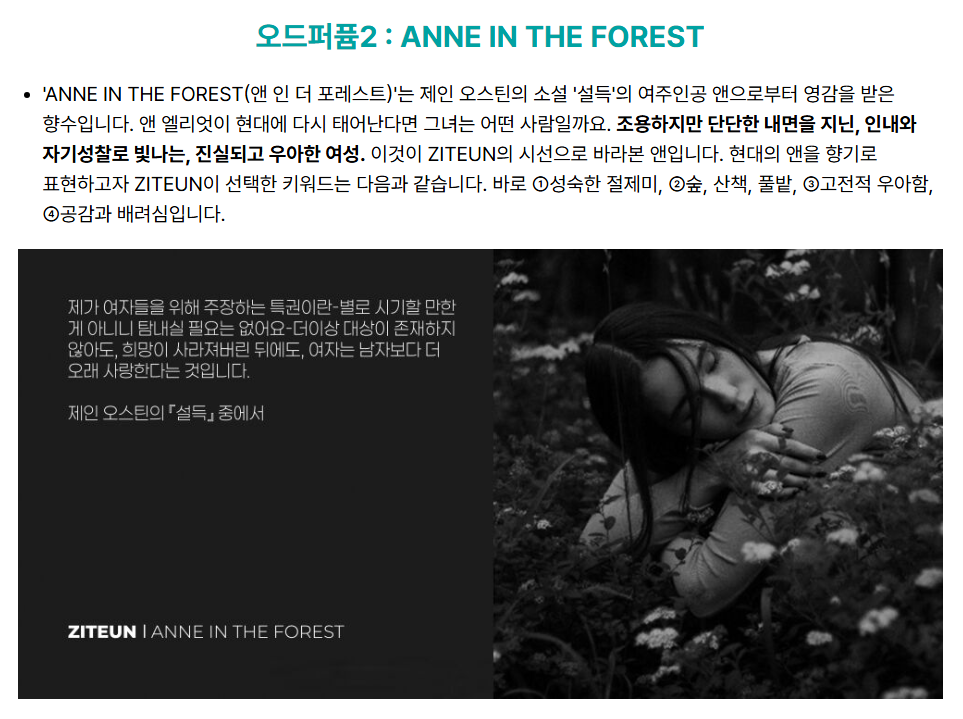 제인 오스틴의 소설 『설득(Persuasion)』에 등장하는 여주인공 '앤'으로부터 영감을 받은 향수입니다. 풀숲을 산책하는 느낌으로 시작하여, 투명하고 우아한 뮈게 플로럴 노트가 풍부하게 느껴진 후, 부드럽고 따뜻한 우디의 잔향으로 마무리하는 구조를 지니고 있습니다. 앤의 우아함, 숲과의 상징적 연결성, 인내와 자기성찰로 빛나는 감성을 담아 '숲 속을 걷는 앤'의 이미지를 향기로 구현하였습니다.